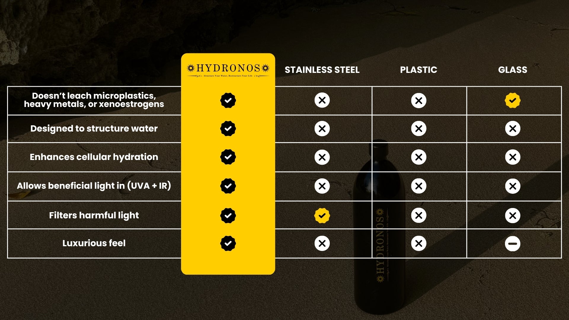 Hydronos makes it possible to create structured water wherever you are. Without harming your body with microplastics and heavy metals.